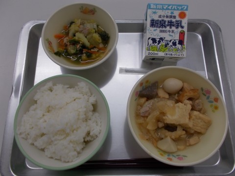 今日のメニューは、ごはん・牛乳・みそおでん・大阪しろ菜と豚肉の煮びたしです。