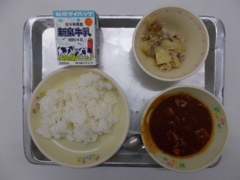 今日のメニューは、ごはん・牛乳・ハヤシライス・エノキベーコンです。