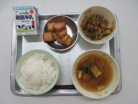 今日のメニューは、ごはん・牛乳・船場汁・厚揚げ田楽・海そうきんぴらです。