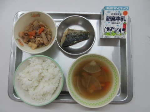 今日のメニューは、ごはん・牛乳・けんちん汁・さわらの幽庵焼き・れんこんのきんぴらです。
