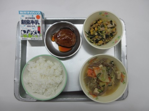 今日のメニューは、ごはん・牛乳・さつま汁・照り焼きハンバーグ・小松菜と白菜の炒め煮です。