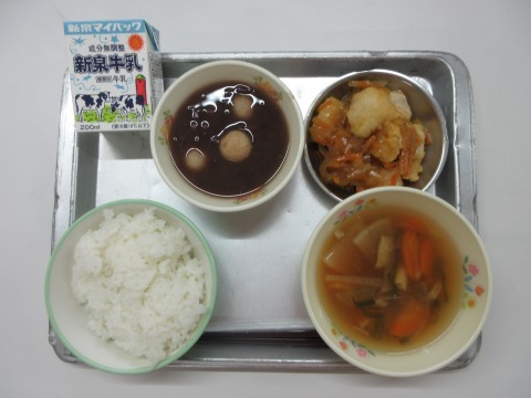 今日のメニューは、ごはん・牛乳・のっぺい汁・鶏から揚げの野菜あんかけ・白玉ぜんざいです。