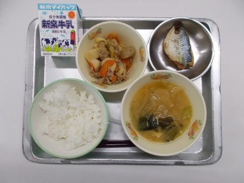 今日のメニューは、ごはん・牛乳・みそ汁・あじのみりんぼし・芋煮です。