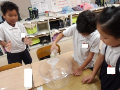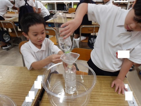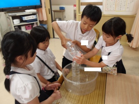 水のかさくらべをしました。くらべ方を話し合ってから、いろいろな容器を使って確かめてみました!
