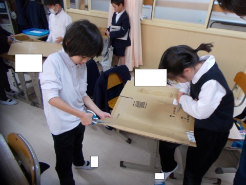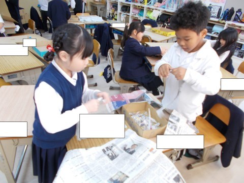 12月に幼稚園交流会を行います。今日の生活科の学習では,幼稚園の子どもたちと遊ぶためのおもちゃ作りをしました。先日の遠足で集めたドングリや松ぼっくりを生かして作っていました。