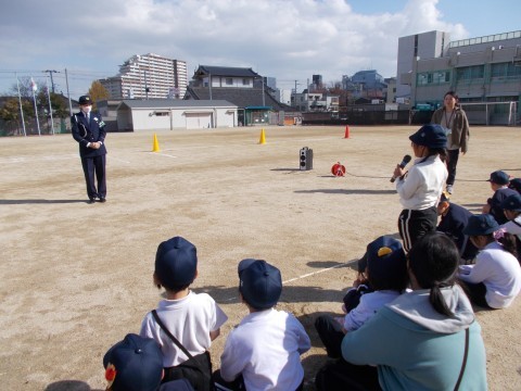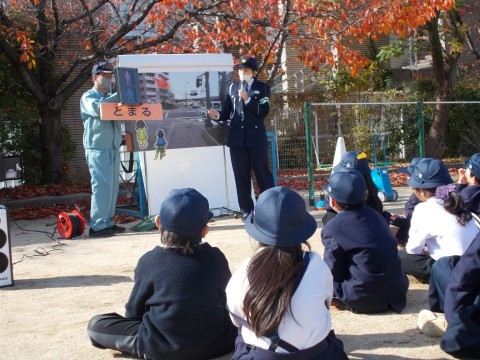 交通安全教室を行いました。警察署や市役所の自転車企画推進課の方から交通ルールについて教えていただき,横断歩道や信号を渡るときにどんなことに気を付けたらよいか考えながら,歩く事ができました。