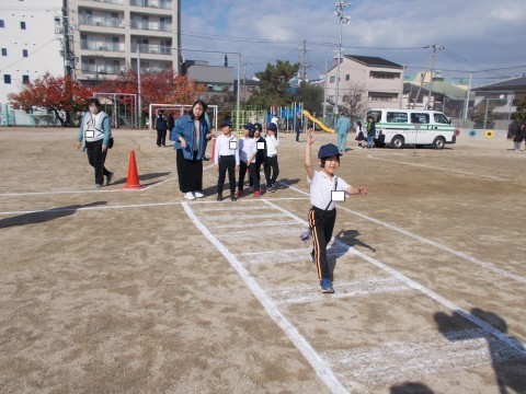チームに分かれてまとあてゲームをしました。真ん中に置いてある,まとを目がけて力いっぱい投げていました。守りの子達は,声を掛け合いながら素早く動いて,ボールをブロックしていました。