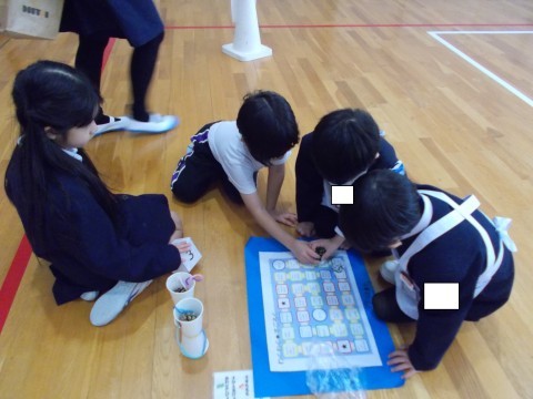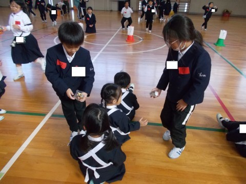 幼稚園交流会がありました。今日の日のためにおもちゃやプレゼント作りを行い,実行委員を中心に進行の練習もしてきました。幼稚園の子達がくると,少し緊張した様子でしたが,グループに分かれてすごろくが始まると,体育館に楽しそうな声が響いていました。いつもは上級生にお世話をしてもらっている1年生も,今日はちょっぴりお兄さんお姉さんの顔になり,上手にリードしてあげることができていました(^^♪