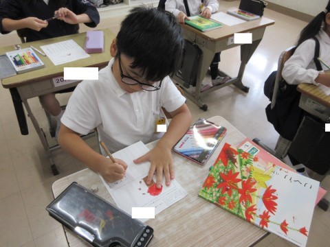 「かきを食べたときに、シャリっと音がしたので、よりおいしく感じた。」など、すてきな秋だよりができあがりました。