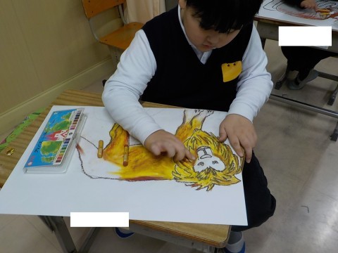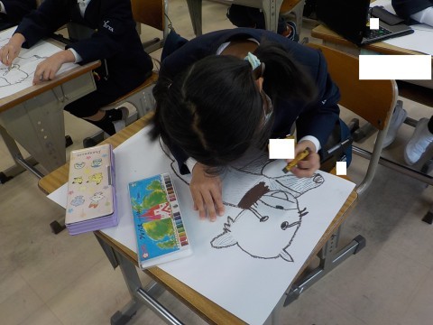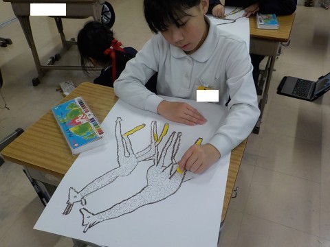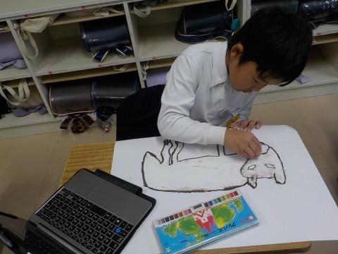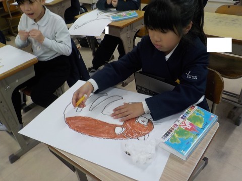 校外学習で行った天王寺動物園で心に残った動物を選び、いっしょに遊んでいる絵をかいています。動物を画用紙に下書きをし、クレパスで色を塗りました。明日からは自分が周りで遊んでいる様子をかきます♪がんばりましょう☆