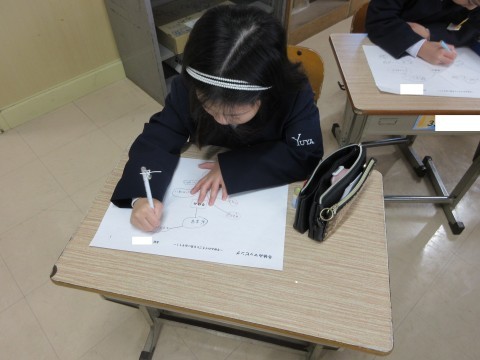 殿馬場中学校から栄養教諭の先生に来ていただき、おせち料理に込められている意味や願いを教えてもらいました。「そんな意味があったんや!」とびっくりした様子でした。また、昔から今まで食べ続けられている理由も考えることができました♪