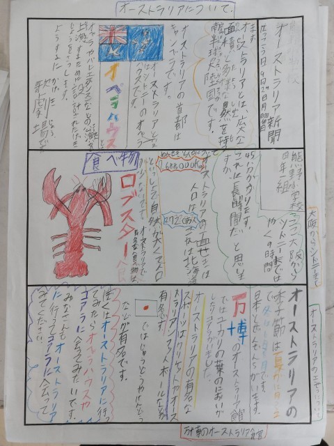 総合で作った新聞を交流しました。万博で行った5つの国の特徴や、おすすめのものや場所をそれぞれ書いた新聞です!