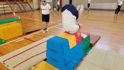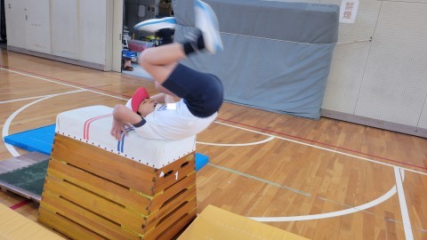 今日は台上前転のポイントを確かめた上で、一人ひとり課題に合わせた課題別練習をしました。