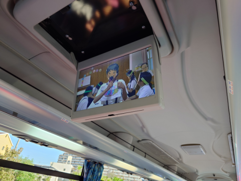 事前に、各グループに分かれて録画したバスレクリエーションを、ビデオで楽しんでいます。