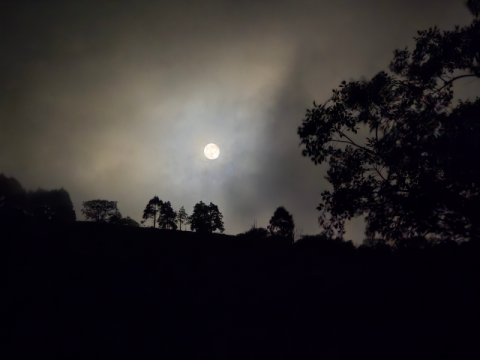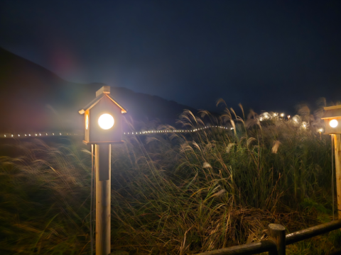 キャンプファイヤーの後、昼間のハイキングコースへ改めて向かい、池の周りを歩きました。昼と違い、灯籠の灯りと月夜に照らされた、幻想的な世界が広がっていました。