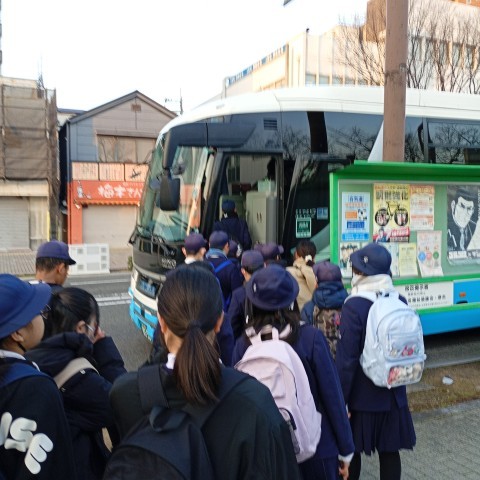 出発式が終わり、キッザニアへ向けてバスに乗り込みました。