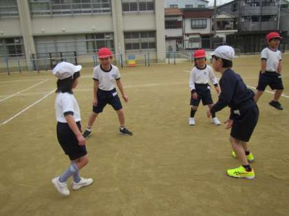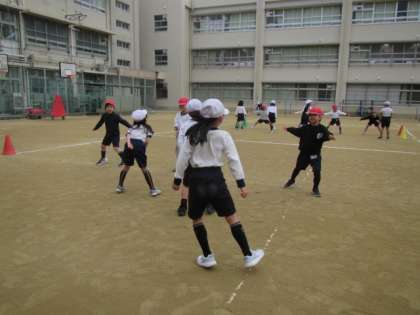 宝とりおにに取り組んでいます。相手のすき間を突き進みます。考えて動くおもしろさをみんなで味わっていました♪