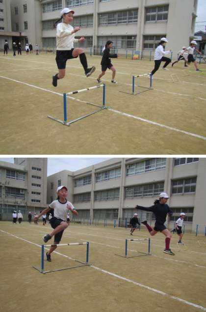 ハードル走に学習が始まりました。今日は、障害物のない30m走のタイムを測定した後、いろんな障害物走を走ってみて、そのおもしろさを探りました♪