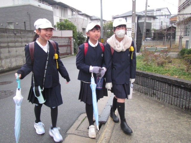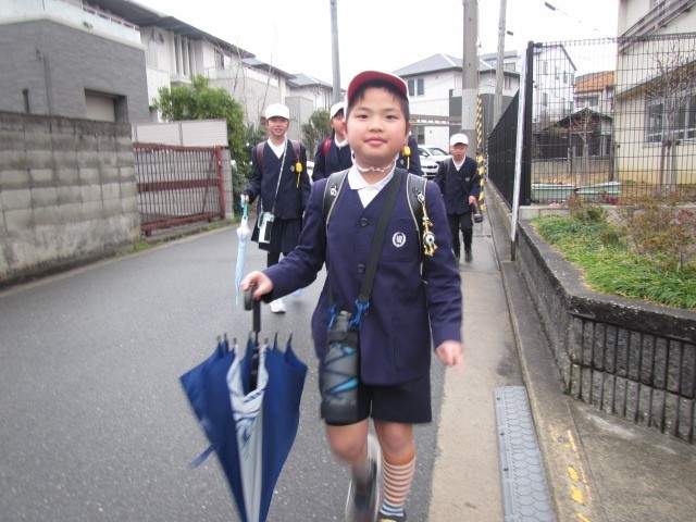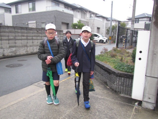 冷たい雨が降る中の登校です。弱い雨でよかった。