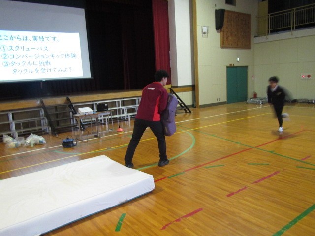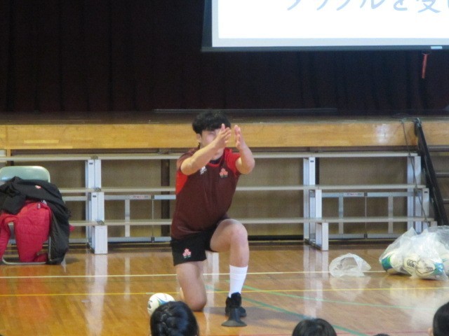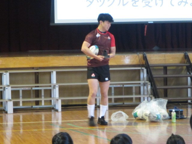 また、ラグビーボールのパスやキック、さらには体力自慢の先生を相手に得意のタックルを実演してくれました。ものすごい迫力でした。