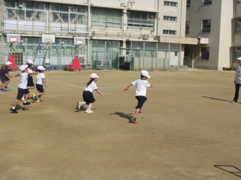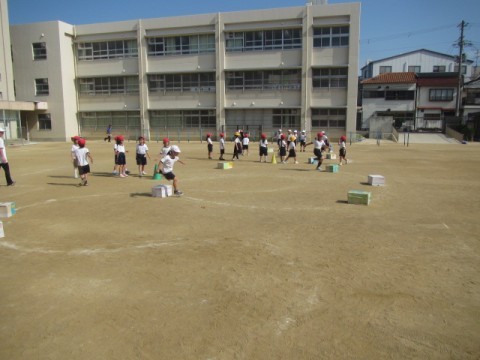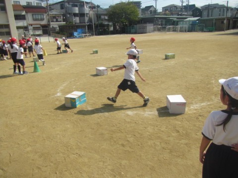 折り返しで大股走,ギャロップなどいろんな走る運動をし,最後に箱を跳び越えて競うS字じゃんけんをしました。