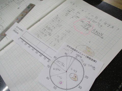 好きな給食のメニューについて,円グラフや帯グラフにまとめました。目盛りを読み間違えないように丁寧に作業していました。