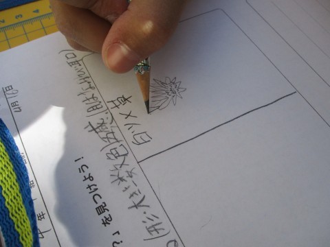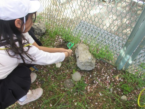 教室でヒントをもらっていたので,草むらの中や石の裏など生き物がいそうなところを丹念に調べて