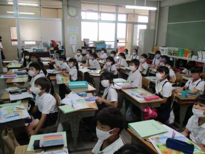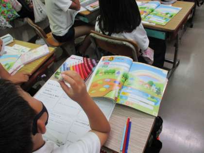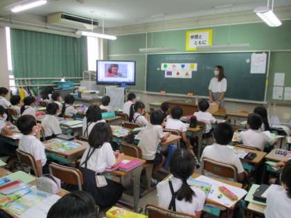 DVDの教材を手本に,しっかりと耳で聞いて活動しています。子どもは,耳がとってもいいですね。