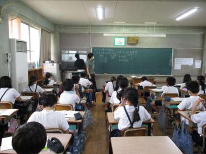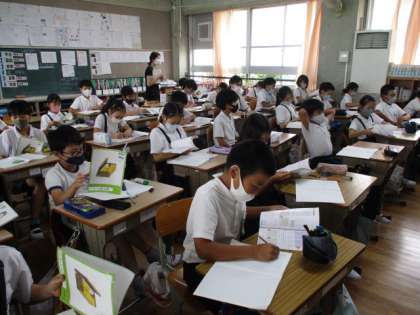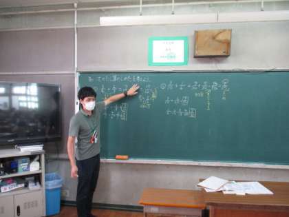 分数のたし算の学習をしています。通分をするのに,公倍数の考えが生きていますね。