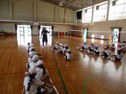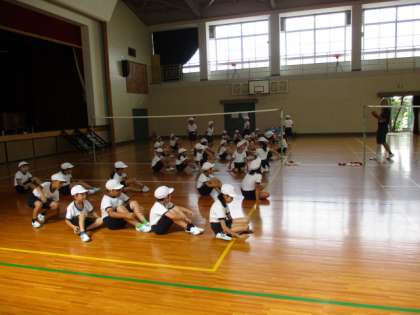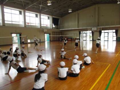準備運動もかねて,グループごとにリレーを取り入れた運動をしています。
