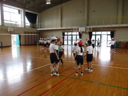 バレーボールの試合をした後,チームで試合を振り返って作戦を話し合っています。