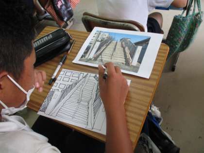 学校の近くの風景を写真に撮り,それをもとに絵を描いています。6年になるとしっかりと描けますね。