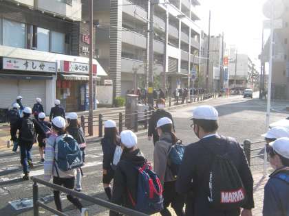 6年生が小学校を出発し,堺高校へ向かっています。2列できちんと歩いています。