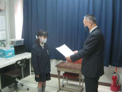 児童会児童の進行で校長先生のお話のあと,『堺っ子書道展』の表彰がありました。代表児童が校長先生から賞状を受け取りました。