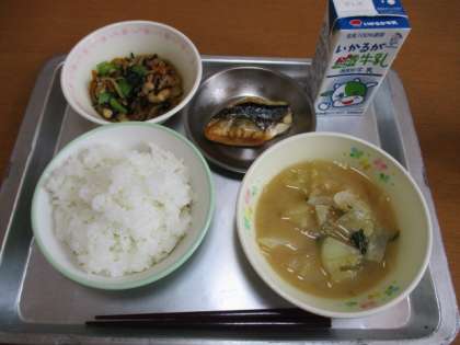「五鉄煮」は,鉄分の多い食品五つを使って作った献立です。その五つは,大豆・ひじき・切干大根・干しいたけ・小松菜です。鉄分は,血液のヘモグロビンの材料です。ヘモグロビンは体中に酸素を運んでくれます。鉄分が足りなくなると,貧血になって体はとてもしんどくなります。「五鉄煮」を食べて貧血を予防しましょう。