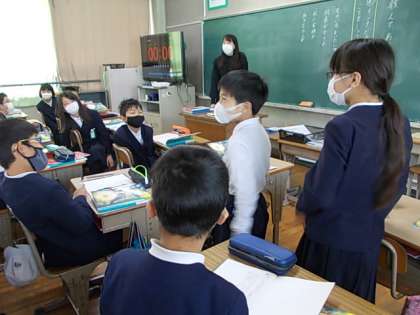 ペアでインタビューをし合い,知ったことを伝えます。「私は…」ではなく,「〇〇さんは…」で始まる他己紹介です。みんな楽しそうに取り組んでいました。