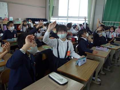 今日からいよいよ給食が始まります。みんなで給食の時の決まりを確認していました。このコロナ禍のなかです。マスクを外して過ごしますので,おしゃべりは当分がまんです!みんな,よろしくね!