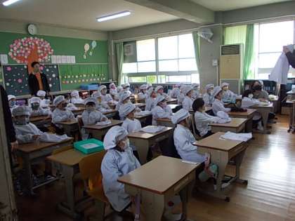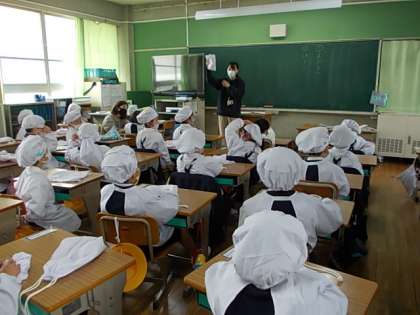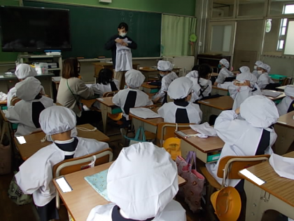 1年生の給食は,今週の金曜日からのスタートとなります。それに向けて,今日はエプロンを袋から出し,実際に着てみました。たたむこともできるかな。先生の説明を聞いて,挑戦します。