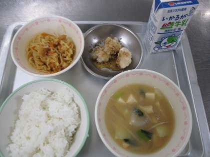 ごまは小さいけど、鉄分を多く含みます。今日の小おかずは、ごまを使ったタレをからめています。しっかりかんで食べてください。