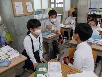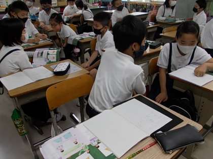 三角形の3つの角の大きさの和は180度でした。四角形ではどうなるかな。みんなで考えていました。