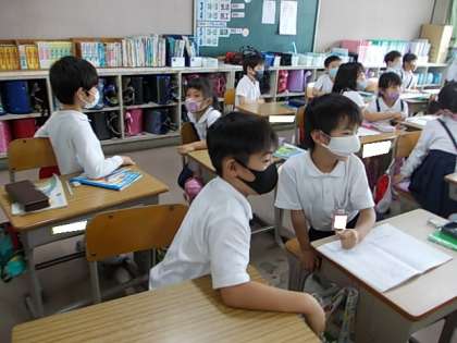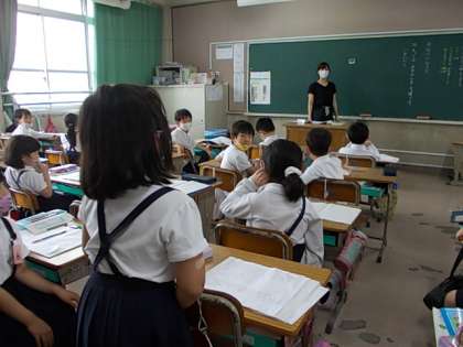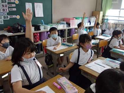 「夏が来ると」「今日は5月17日です。明日は」など,先生が提示する文や文章の一部に続く言葉を考えていきます。みんな,本当によく考えていてすごいです。