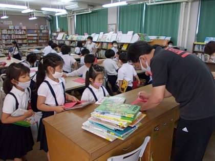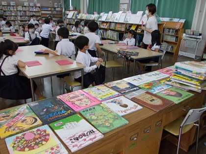 前回借りた本を返して,次の本を借ります。図書室には,みんなが興味を持ちそうな魅力的な本があふれています。今日はどんな本を借りようかな。