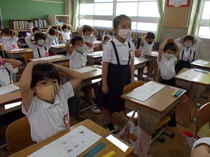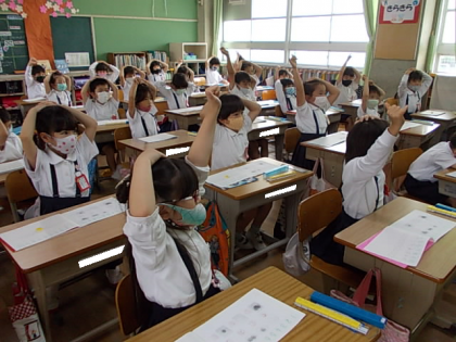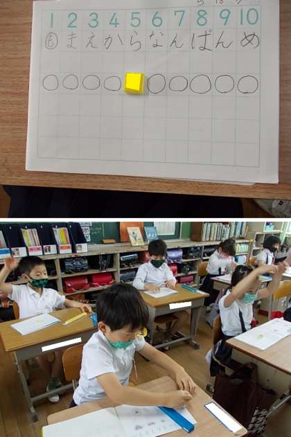 順番の学習です。ノートに書いたマスを使い,先生や友だちが言う「前からなんばんめ」にあたる部分に算数ブロックを置きます。数を表す「なんこ」と順番を表す「ばんめ」のちがいを学びます。