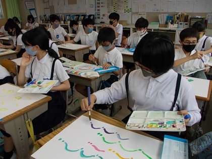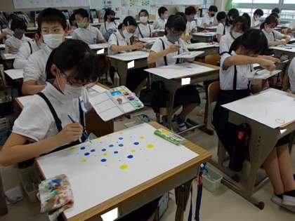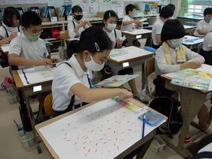 自分が選んだ音を絵で表現します!おもしろいね。自分が選んだ音のイメージが,絵の具の色や濃さ,描く線の太さや長さに現れます。