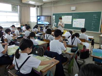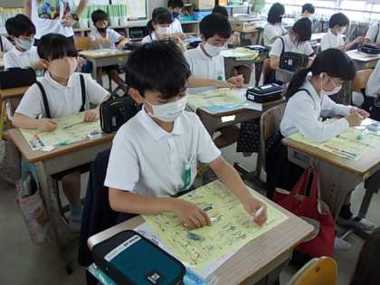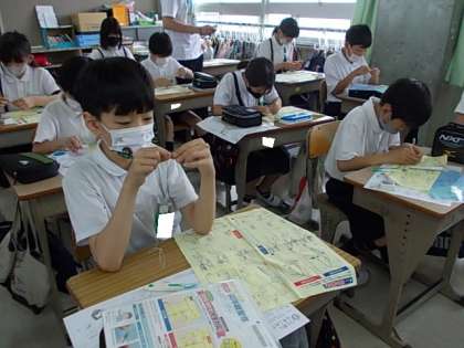 さいほうの学習が始まりました。今日は「ぬう」学習です。まずは,縫い針に糸を通します。みんな,生き生きと活動しています。