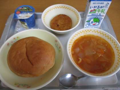 イタリアではおいしいトマトができるので、トマトを使った料理がたくさんあります。今日のミネストローネには、とりにく・たまねぎ・セロリ・キャベツ・にんじん・トマト・いんげん豆などが入っています。