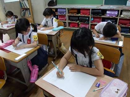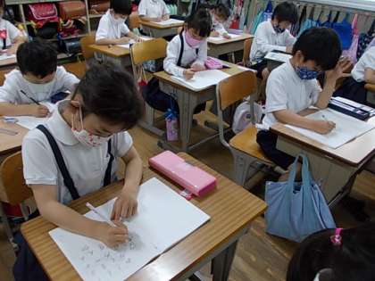 物語「はなのみち」の学習が始まっています。今日は物語の冒頭場面を読み,これからどんなことが起こりそうか,みんなで考えていました。袋の中身は何なのか,みんな,自分のイメージをノートにかいていました。