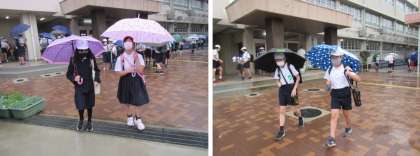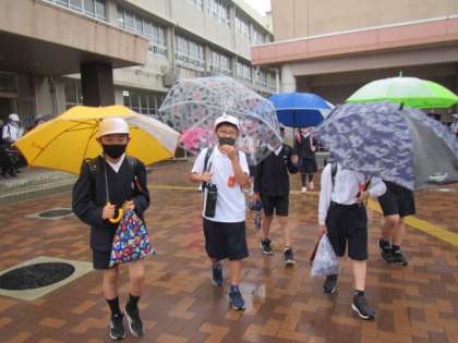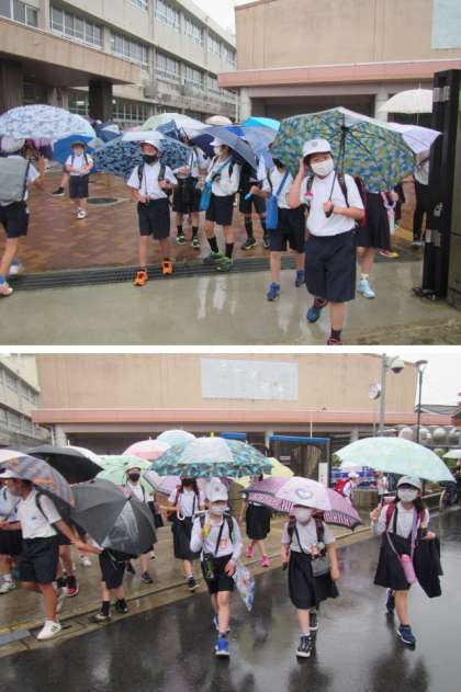 昼の勢いはないものの結構な雨の中での下校となってしまいました。傘を差しながらの下校,みんな気をつけて帰ってね♪