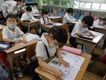 今日はひらがなの「ひ」を学習しました。みんなで「ひ」から始まる言葉を集めた後,書き方のポイントを確認し,練習を進めました。