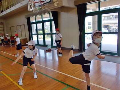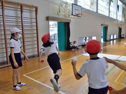 バトミントンの羽を使って「投げる」ことを学習します。体育館の反対側にある的まで,何回でたどり着けるかな。力いっぱい,的をねらって投げます。ゴルフのようなゲームです。楽しそう♪